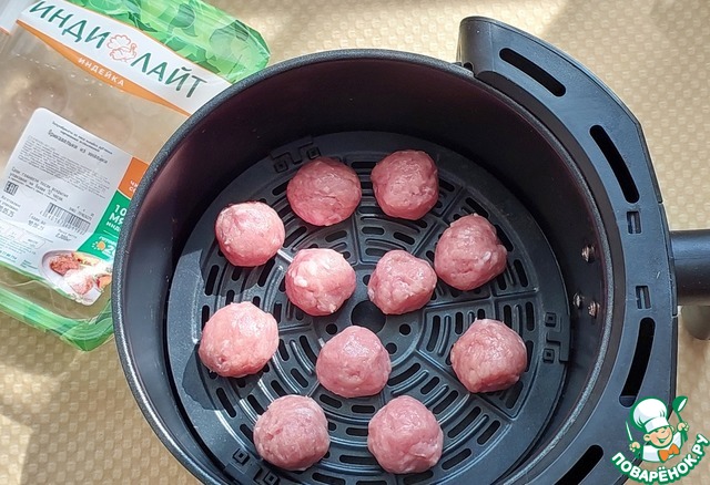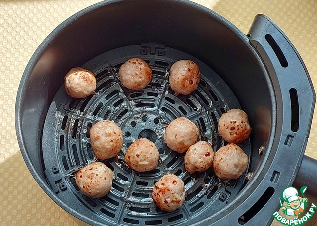 • Фрикадельки поместить на решетку аэрогриля. Можно запекать любым удобным способом.
