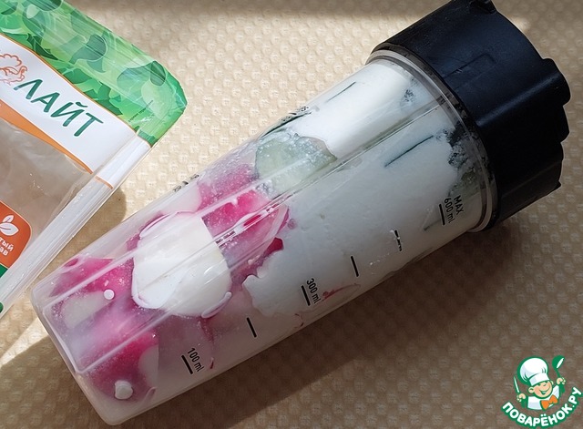 • Отмерить йогурт и молоко в блендер, добавить нарезанные овощи и специи.
