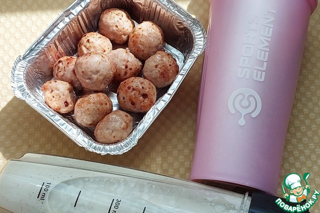 • До подачи фрикадельки хранить в тепле, а смузи в холоде. Если блюдо готовится на выход, то фрикадельки помещаем в изотермический контейнер или фольгу. Впрочем, остывшие они тоже вкусны. Смузи удобно брать с собой в шейкере, у меня простейший, с пружинкой внутри. Дополнительно можно взять с собой лед в термокружке.