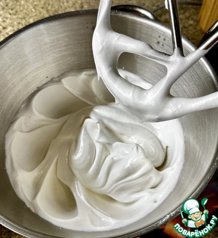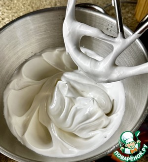 Сахар смешал с ванильным сахаром, смешал и по 1 ст. л. добавляя смесь к белкам, взбил их до пышной и устойчивой белковой массы.