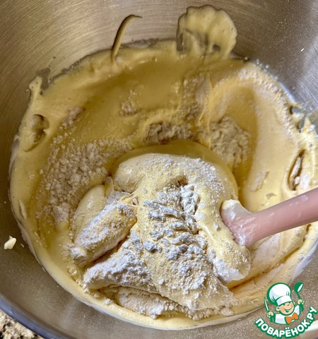 Смешал молоко с растительным маслом и добавил в тесто в два приема. Перемешал. Очень деликатно, без усилий. Скорее просто переворошил, но добился однородной…, ммм … сильно влажной, скажем так, воздушной массы.