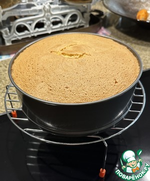 Оставил бисквит на 10 минут, пока он не выровняется в уровень формы. Поставил форму на решетку, дал остыть…,