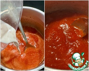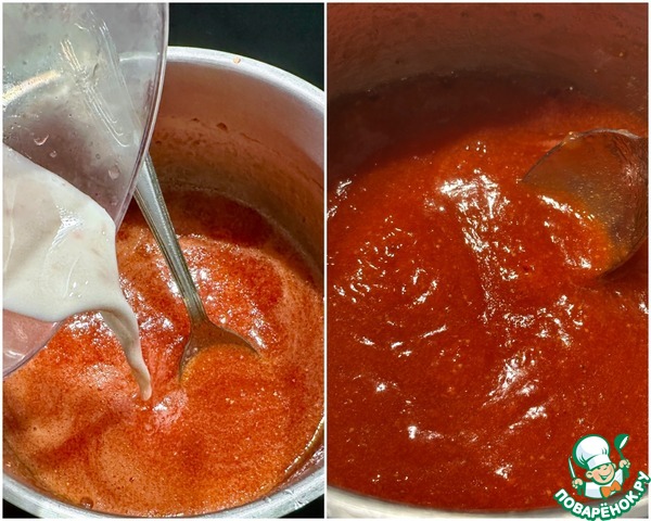 Крахмал развел водой и влил его в ковшик. Перемешивая, довел до кипения и, снижая температуру варил еще 50 секунд. Прогревал скорее, но при неспешном взбулькивании.