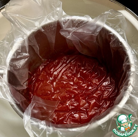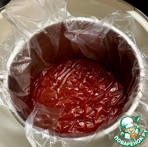 Снял с нагрева и накрыл пленкой «в контакт». Поставил в холодную воду, чтобы остудить. Потом убрал в морозилку на 30 минут (можно в холодильник на 1,5 – 2 часа).