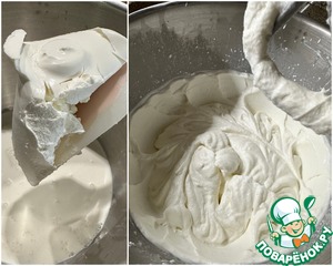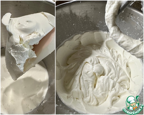 Творожный сыр смешал с сахарной пудрой и сливками. Взбивал на высокой скорости минут десять до светлой, пышной массы.