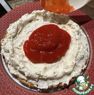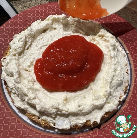 Намазал корж кремом. Сделал бортик. Выложил клубничную начинку. Размазать начинку надо, конечно.