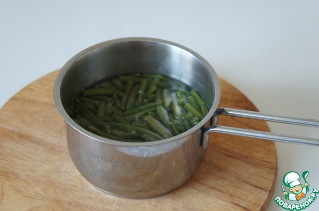 Стручковую замороженную фасоль опустить в солёную кипящую воду, довести до кипения и снять с огня.