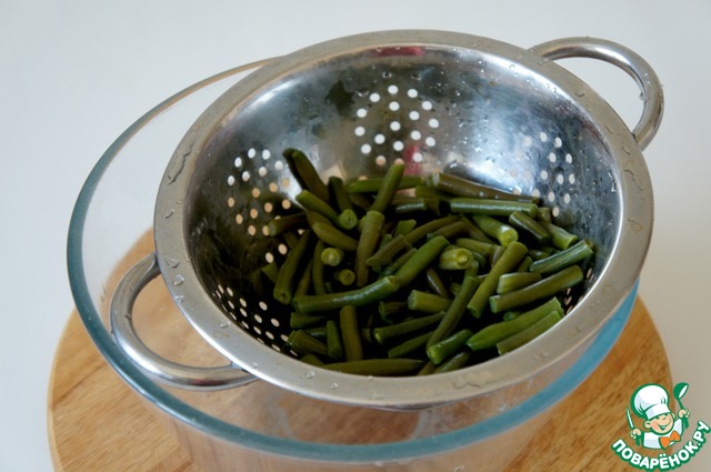 Через 3-4 минуты, переложить фасоль в ледяную воду, оставить на пару минут, затем откинуть в дуршлаг.