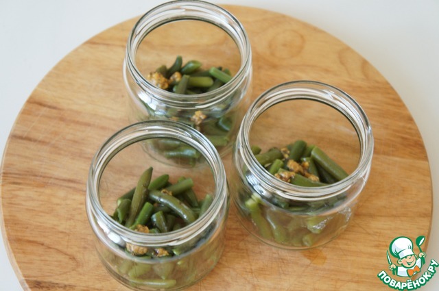 На дно баночек разложить фасоль, полить ложкой соуса.