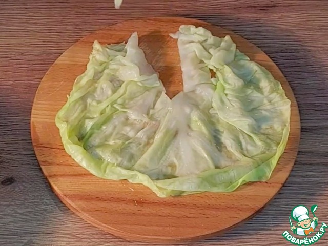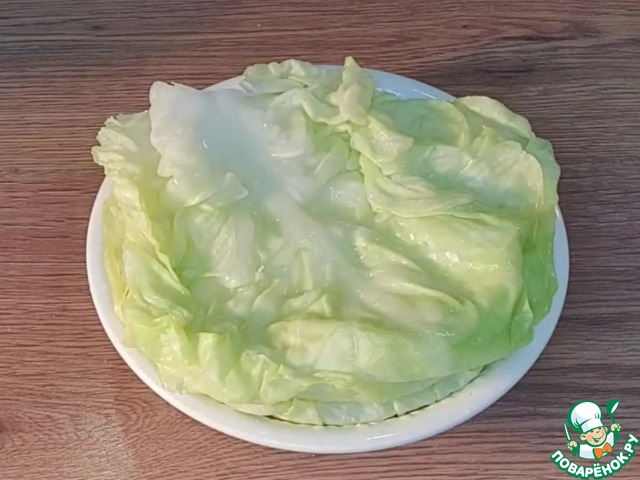 2. Сначала подготовим капусту. Надрезаем капустные листы у основания кочерыжки. Опускаем кочан в кипяток и варим от 3-5 минут, так чтобы листья стали мягкими, но не сварились. Осторожно извлекаем кочан и снимаем несколько мягких листьев. У меня рецепт на пробу, поэтому готовила 7 порций, значит 7 листиков.
