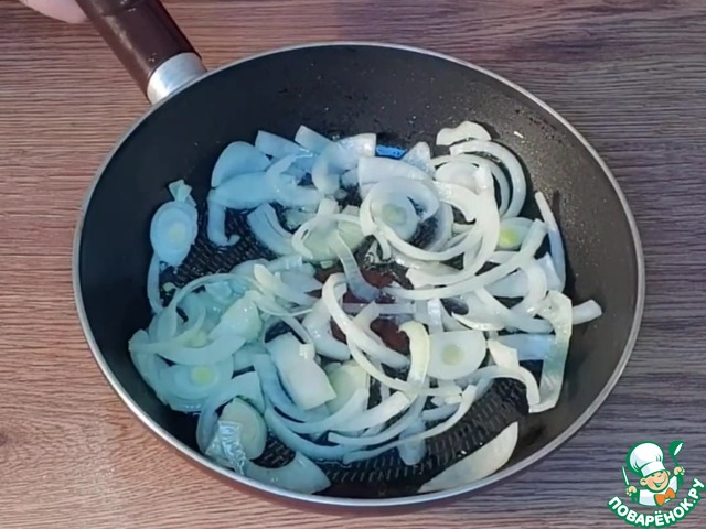 5. Лук нарезаем полукольцами и обжариваем на разогретом растительном масле (2 ст. л.), 3 минуты.
