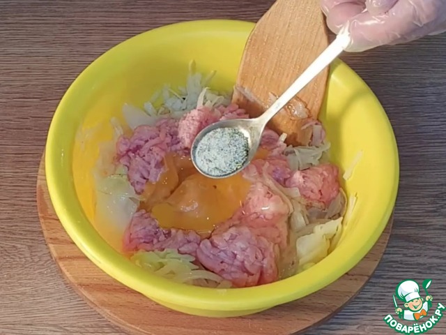 6. В миске смешиваем фарш индейки, картофель, 1 яйцо, срезы от капустных листьев и жаренный лук. Добавляем специи.