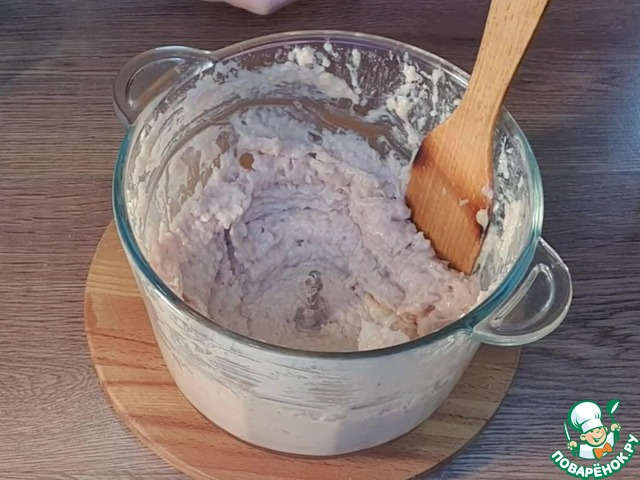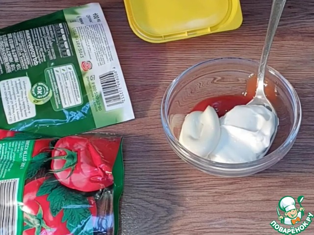 14. Приготовим соус. Смешиваем по 1 ст. ложке: майонез, кетчуп томатный и мягкий плавленный сыр.