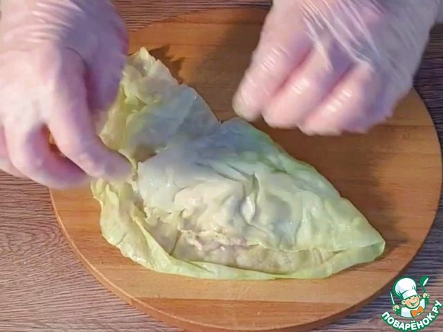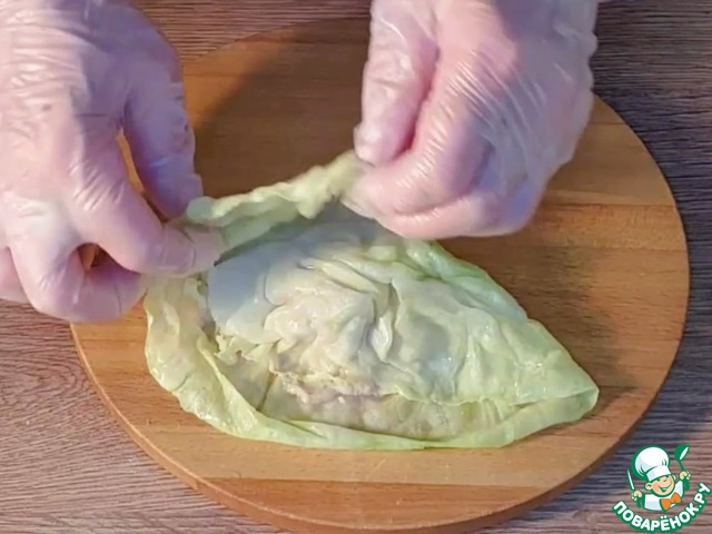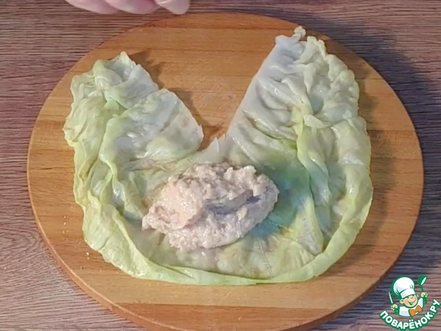 8. Формируем голубцы. На капустный лист кладем 1-2 ст. л. начинки.