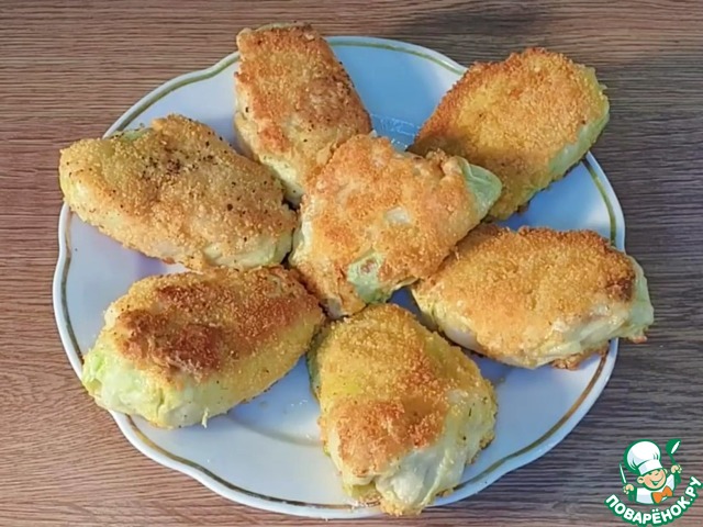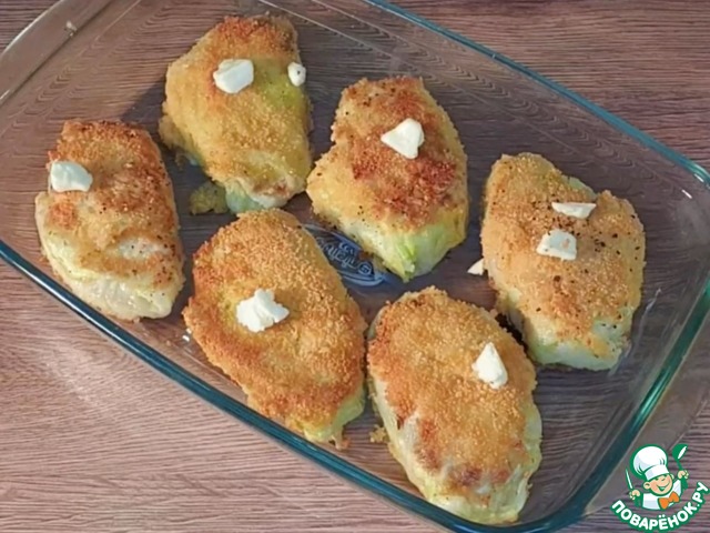 Эти голубцы готовятся из нежного мяса индейки с капустой вместо риса, но не уступают по вкусу классическим голубцам. За счёт того, что голубцы вначале обжаривают в панировке, а затем подпекают в духовке. Голубцы приобретают более отчётливый вкус и аромат.