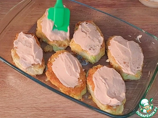 13. Смазываем форму для выпечки холодным сливочным маслом и перекладываем обжаренные капусту с начинкой в форму. Горячие капустники можно смазать сливочным маслом.