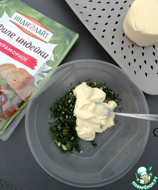 • Измельчить зелень и чеснок, перемешать с майонезом.