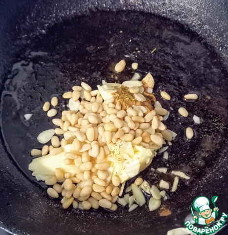 В глубокой ёмкости разогреть сливочное масло, добавив кедровые орешки, миндаль, корицу и кардамон. Жарить до золотистости.