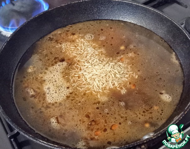 Добавить рис, соль и перец. Жарить буквально одну минуту. Затем добавить курагу, изюм и влить воду.