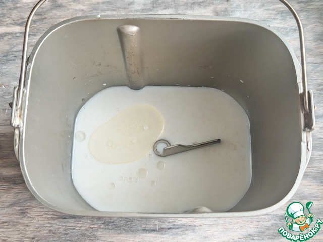Тесто я буду замешивать в хлебопечке. Добавить дрожжи в тёплую воду с молоком. Далее добавить: соль, сахар и растительное масло.