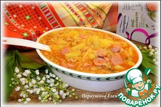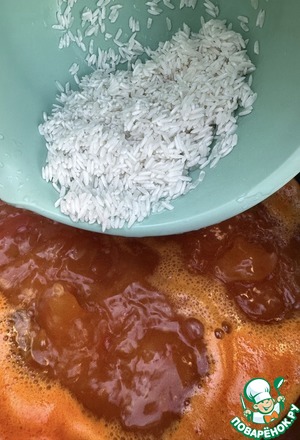 У меня объём бульона получился литра два с половиной. Рис я хорошо промыл шесть столовых ложек (с «небольшой горкой»). И в бульон рис высыпал. У меня лазер был. Поэтому минут через пятнадцать он был почти готов.