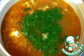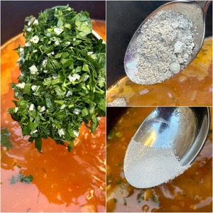 И в казанок отправились: толчёный чеснок с мелко нарезанной зеленью петрушки, кинзы и укропа, сухие сунели двух видов. На этом этапе суп надо сбалансировать «на соль», что называется.