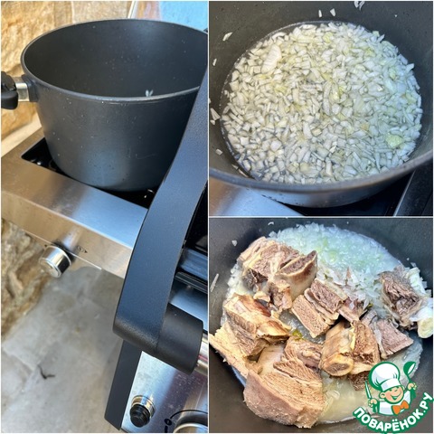 Порубил я тройку луковок, стараясь не мельчить особо, но и не укрупняя. Засыпал рубленое в казанок, залил бульоном. Сверху снимал, чтобы с жирком. На минимальном нагреве, изредка помешивая, тушил лук минут десять.