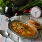 Луковку среднего размера, чайную ложку перцев горошками, пару лавровых листиков (их минут через двадцать лучше из кастрюли удалить). Букет зелени. По три-четыре ветки петрушки, кинзы и укропа. Для удобства ниткой связать стоит. Всё! Если кому хочется можете расширить список специй и приправ. Но я, например, не рекомендую. Хорошее улучшать – однозначно испортить!