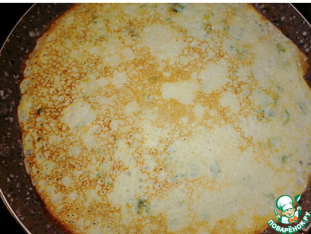 Выпекать блинчики на смазанной маслом сковороде (только для первого блина) с двух сторон до румяности.