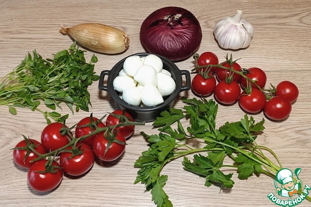Черри порезать пополам. Нарезать лук и чеснок. Зелень измельчить.