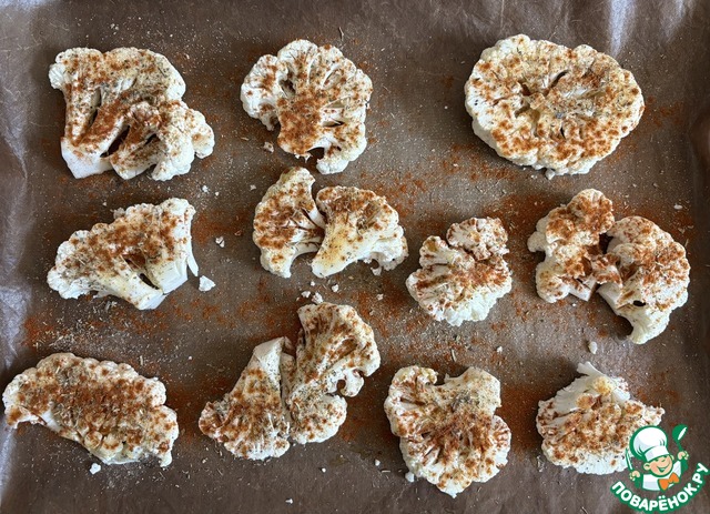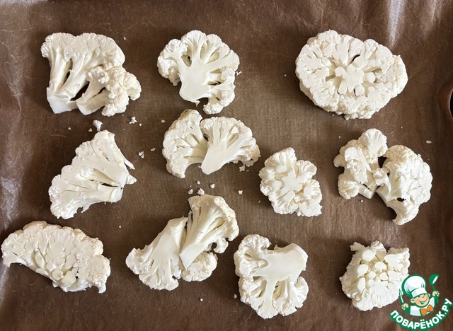 Помыть капусту под проточной водой и нарезать шайбами толщиной 1,5 - 2 см. Уложить на противень, застеленный бумагой для выпечки.