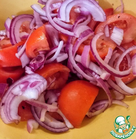 Они сформируют основу салата. На помидоры выложить красный лук. Полить 1 столовой ложкой оливкового масла. -
