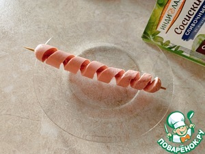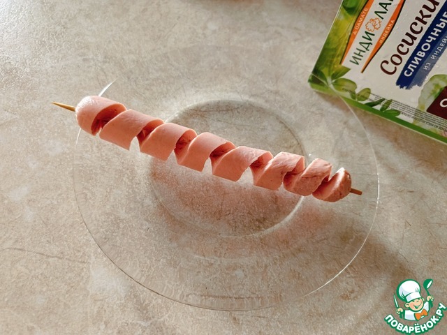 Сосиску аккуратно проткнуть посередине деревянной шпажкой. Острым ножом по спирали сделать разрез до шпажки. И осторожно растянуть по длине так, чтобы вся конструкция поместилась на сковороде.