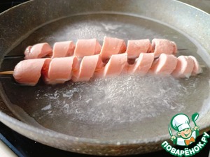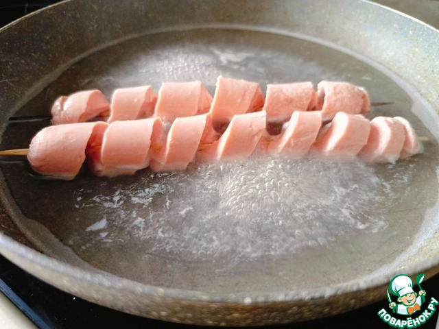 На сковороду налить воду и довести до кипения. Положить шпажки с сосисками и варить, поворачивая со всех сторон.