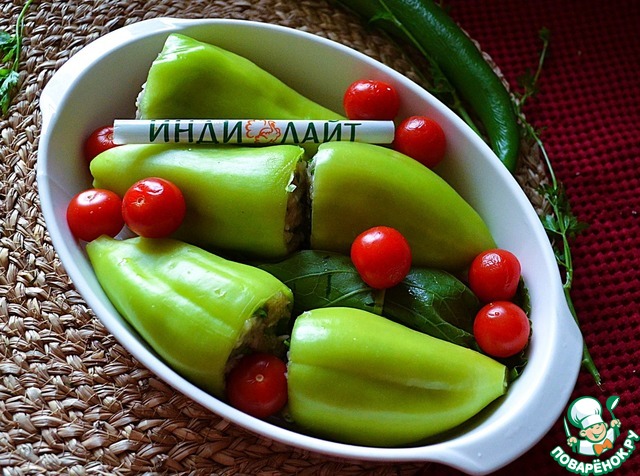 • Перцы начинить, выложить в огнеупорную форму, добавить вымытые черри.