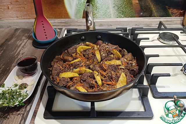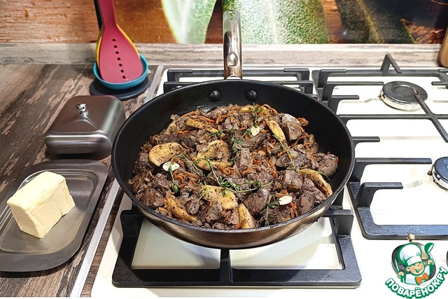 У печени убрать прожилки и лишний жирок порезать помельче, добавить в сковороду, влить вино и жарить пять минут. Вино выпарится, а аромат останется.
