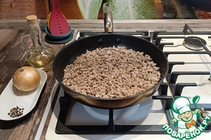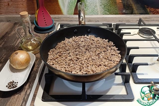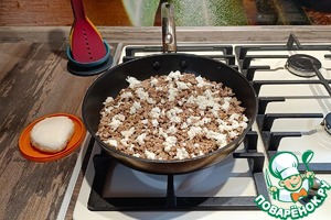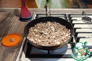 Лук почистить, порезать мелким кубиком. На антипригарной сковороде с малым содержанием растительного масла обжарить мясо с луком.