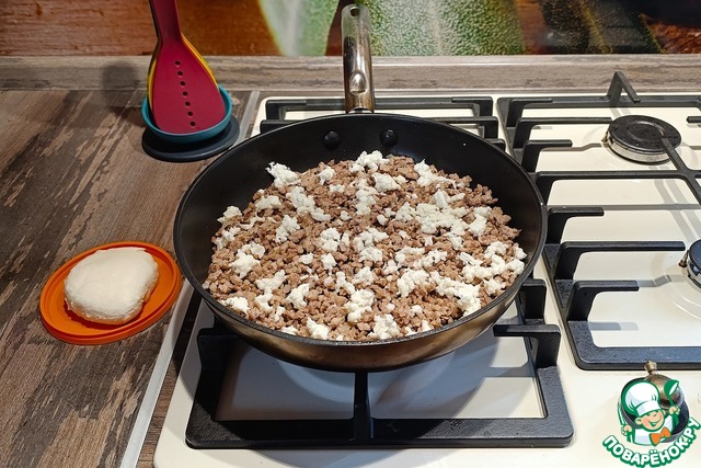 Сыр моцареллу потереть на терке, добавить к мясу.