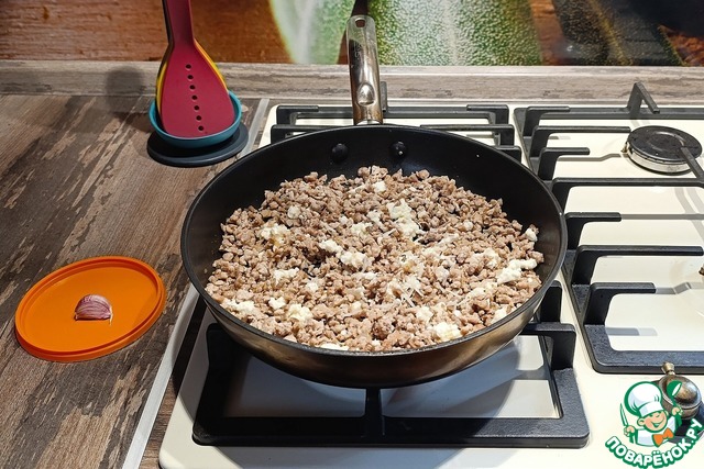 Зубчик чеснока почистить, измельчить, добавить в сковороду.