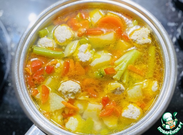 • Фрикадельки в супе готовы, добавить обжаренные лук, перец болгарский и морковь