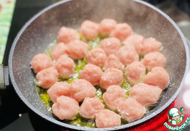 • В фарш добавить соль, перец, перемешать, сделать фрикадельки, обжарить слегка на сковороде с одной столовой ложкой оливкового масла, чтобы не было мясной пены в супе