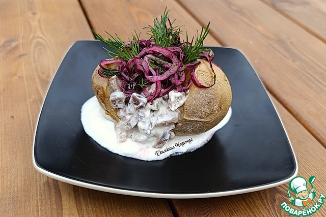 Закуска по-русски: картофель, запеченный на соли, с селедкой в сметане и маринованным луком. Такую закуску подают в ресторане. Шеф-повар поделился своим рецептом. Что может быть вкуснее печеного картофеля?! И прикольная начинка делает блюдо совершенно бомбическим!