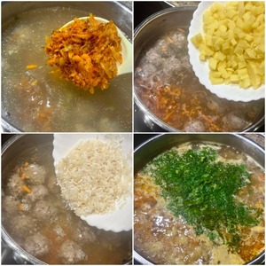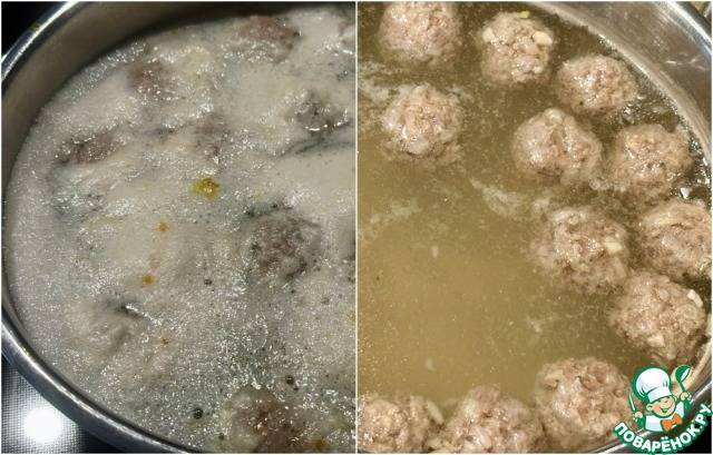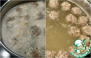 А дальше… Есть такая привычка закладывать фрикадельки в кипящую воду. Типа, тогда они точно не развалятся и … Но! Рецепт то я подсмотрел в интернете, а там автор закладывала фрикадельки именно в холодную воду. Мотивировала она тем, что мясо, когда варим бульон, мы закладываем именно в воду холодную. Для того, чтобы бульон получился прежде всего вкусным.