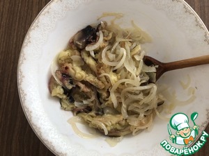 Добавить в массу баклажан, чеснок пластинками, порезанную зелень, перемешать и откорректировать по вкусу.