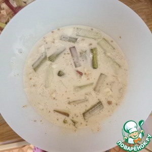 В отдельной ёмкости приготовить самбал, смешав кокосовое молоко, ревень, имбирь, лук-шалот, сок одного лайма, перец красный жгучий, рыбный (или устричный) соус, а также соль и черный перец. Отложить в сторону, а лучше всего положить в холодильник на 30 минут.