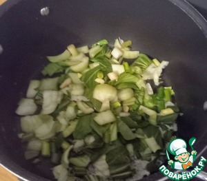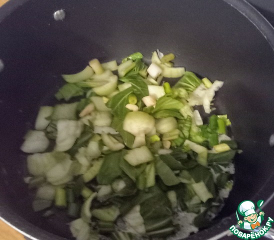 Тем временем, разогреть масло в крупном воке на огне чуть выше среднего, добавить пак-чой, чеснок и зелёный лук. Жарить минуты две, или до того, как пак-чой приобретет ярко зелёный окрас.