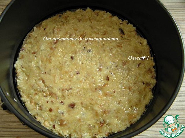 Перемешайте, выложите в разъемную форму диаметром 18 см, разровняйте и слегка утрамбуйте. Уберите в холодильник.