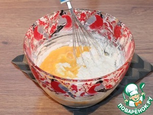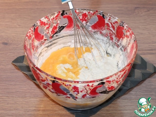 4. Влить теплый кефир и взбитое яйцо, перемешать.