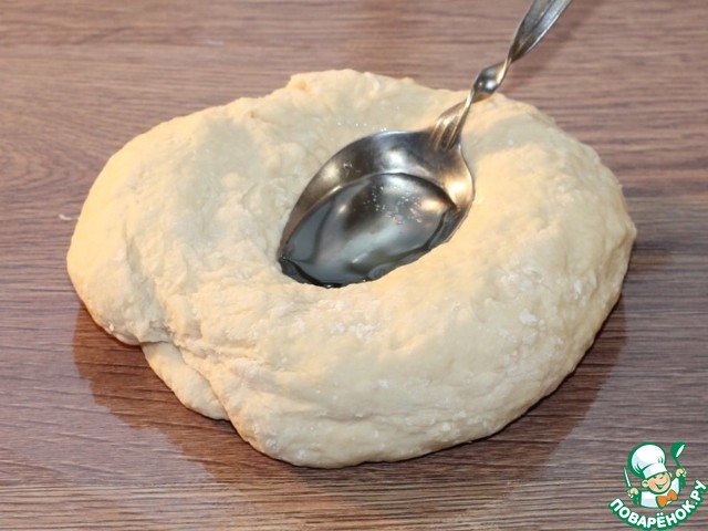 7. Влить растительное масло (1 ст. л.) и замесить мягкое тесто. Оно должно стать однородным, гладким и не липким. Тесто скатать в шар.