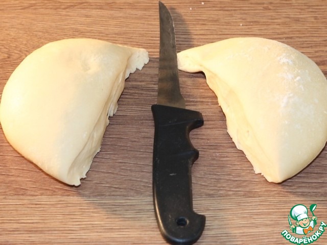 10. Делим тесто на две части и обминаем. С одной работаем, а вторую часть теста скатываем в шар, убираем в миску и закрываем. Тесто старайтесь не забивать лишней мукой.